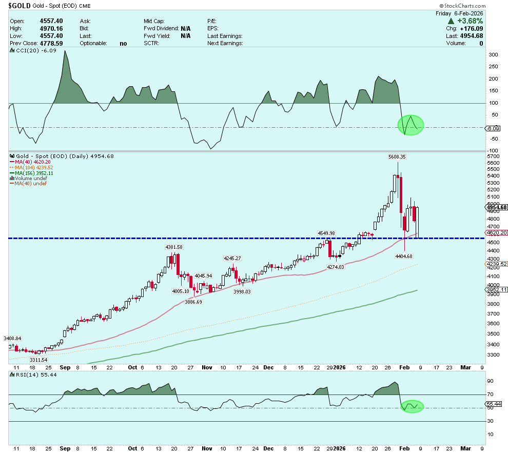 The support that emerged near the prior resistance level at ~$4,550 was no accident. Last week’s lows also briefly breached the rising 40-day moving average, but did not stay below this key moving average for very long. Overall, this appears to be a typical bull-market correction, with price finding support exactly where it was supposed to.