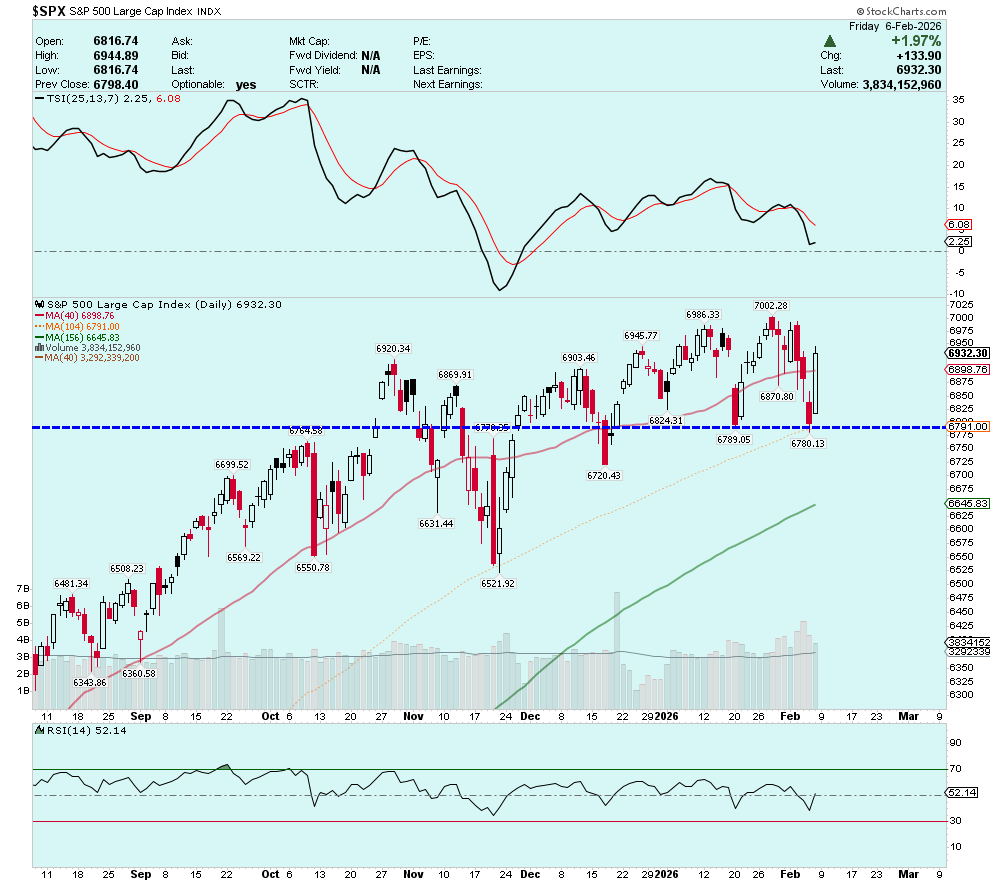 Turning to the broader market, by Thursday afternoon we were witnessing a meltdown in AI stocks and crypto. The pain was beginning to spread to other market sectors, and the S&P retested important support just below the 6800 level: