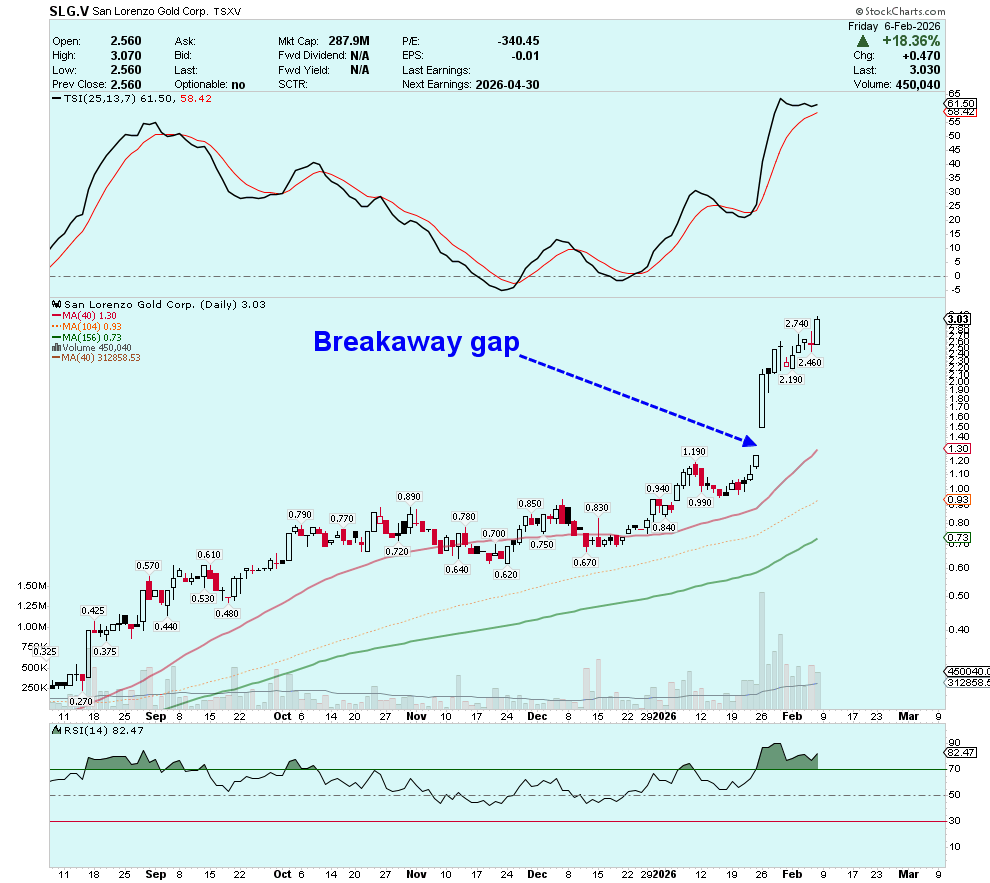 Turning to the juniors, I am in awe of the rise in some of the Goldfinger Capital (GC) favorites such as San Lorenzo Gold (TSX-V:SLG), Kingfisher Metals (TSX-V:KFR), and Andina Copper (TSX-V:ANDC). In particular, San Lorenzo Gold continues to levitate on an almost daily basis: