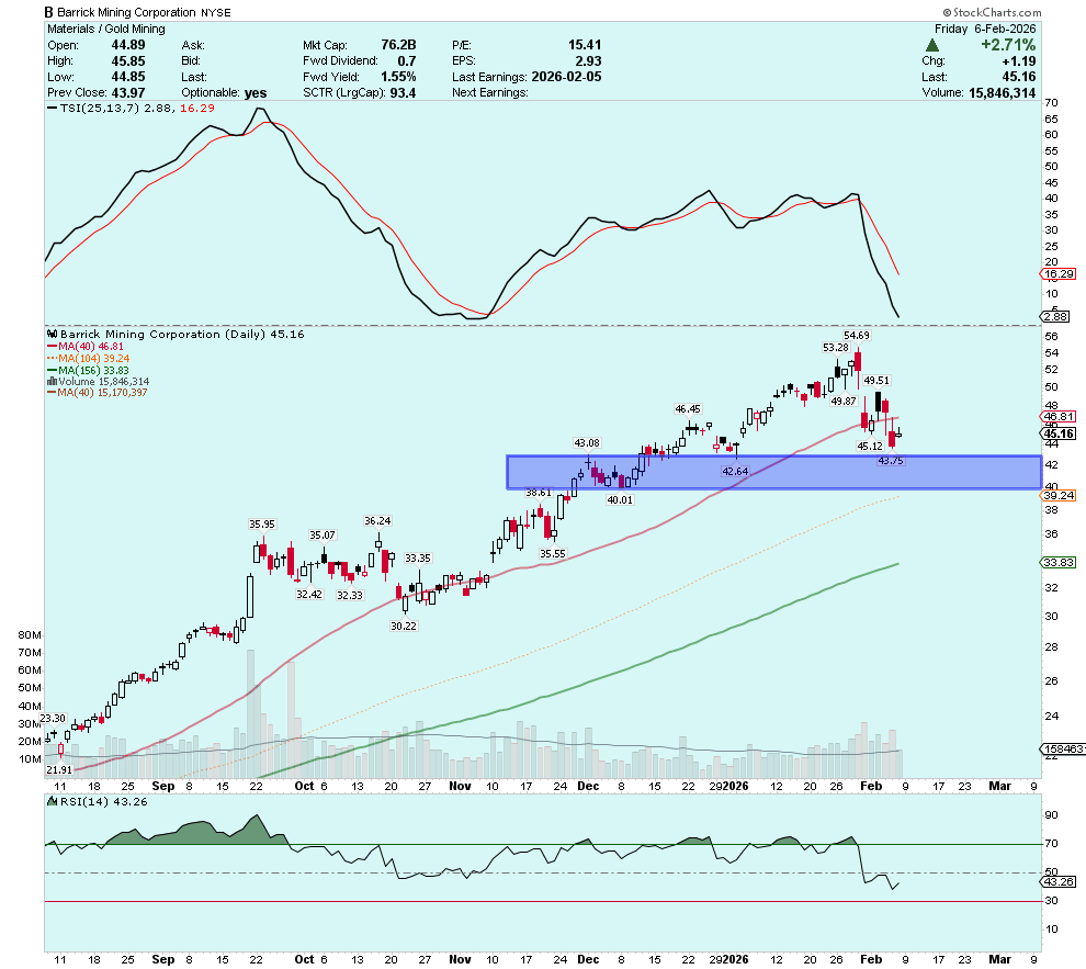 Beyond the short term issues and rising gold production costs (industry-wide phenomenon), I believe Barrick remains one of a handful of top notch gold producers that investors should look to add on weakness. At $54/share it may have been a little overheated in the near term, however, I will be warming up to Barrick on dips into the US$40-$43 long-term support zone.