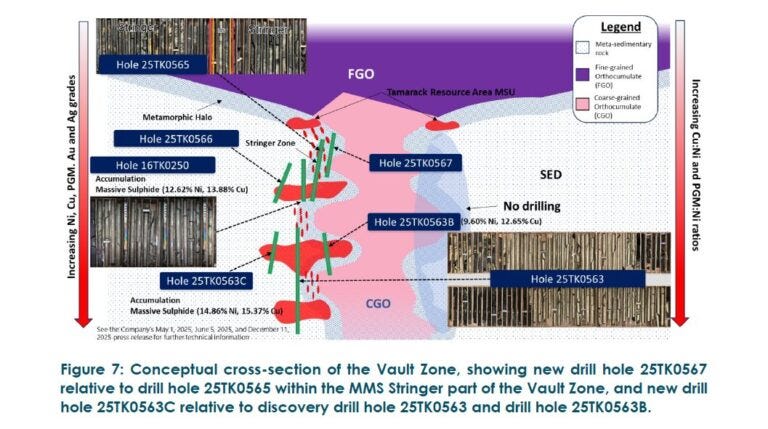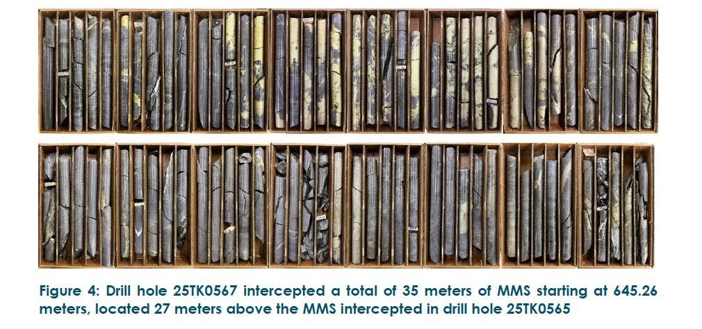Another new drill hole 25TK0567, located 79 meters below drill hole 12TK0153C within the Tamarack Resource Area intercepted a total of 35 meters of MMS starting at 645.26 meters (assays pending), located 27 meters above the MMS intercepted in drill hole 25TK0565.