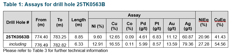 Talon reported that new drill hole 25TK0563C, drilled 16 meters to the southwest of drill hole 25TK0563, intercepted 8.26 meters of MSU and Mixed Massive Sulphides (assays pending) at the same stratigraphic horizon as the upper part of drill hole 25TK0563 and at a similar depth to drill hole 25TK0563B, starting at 773.95 meters.
