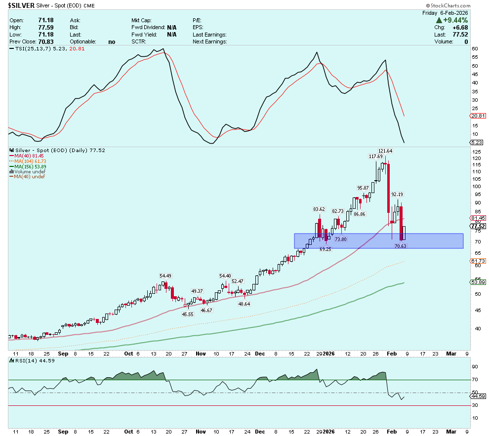 I view the defense of the $70/oz support level on a weekly closing basis as a very encouraging development. However, it is also clear to me that silver likely needs another two to three weeks to hammer out a more robust basing pattern. Nothing would be more bullish than silver trading in a $70–$85 range for the remainder of February. That said, something tells me silver will not follow my preferred script, and we could be in for both a drop back into the $60s and a rally into the $90s.