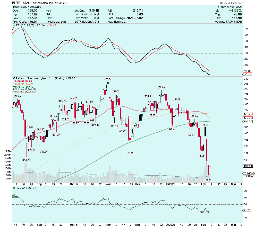 Last weekend, I was struck by how badly damaged many of the AI-related stock charts looked. Those charts deteriorated meaningfully last week, with Friday’s stick-save rally doing little more than temporarily plugging a finger into a gaping hole on a leaking ship.