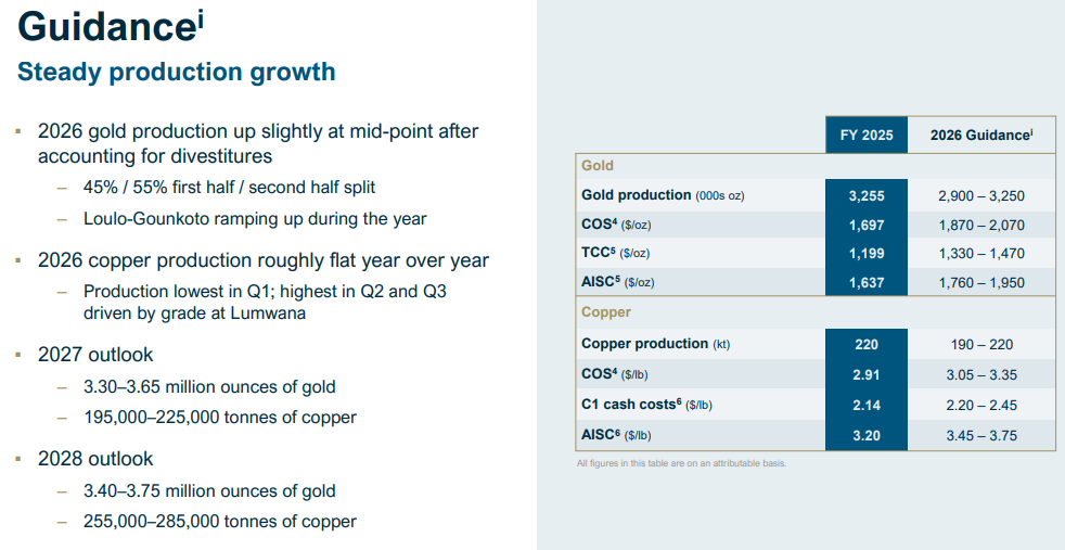 Full-year gold output fell vs the prior year (~17 % lower), and the 2026 guidance is relatively flat around ~3,000,000 ounces, implying modest growth. Additionally, all-in sustaining costs (AISC) for gold increased (~$1,800 to $1,900/oz) — above guidance and trending upward — eating into margin expansion from higher prices.