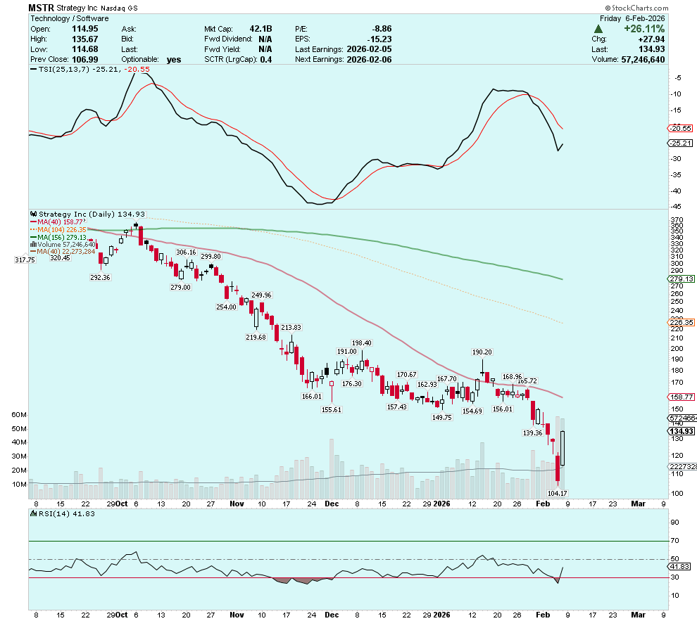 It’s wild to think about it, but at Thursday night’s low Bitcoin had fallen more than 50% from its early October all-time high at ~$126,000. Friday’s risk-on reversal couldn’t have come at a better time for a number of beaten-down stocks, including Michael Saylor’s MSTR: