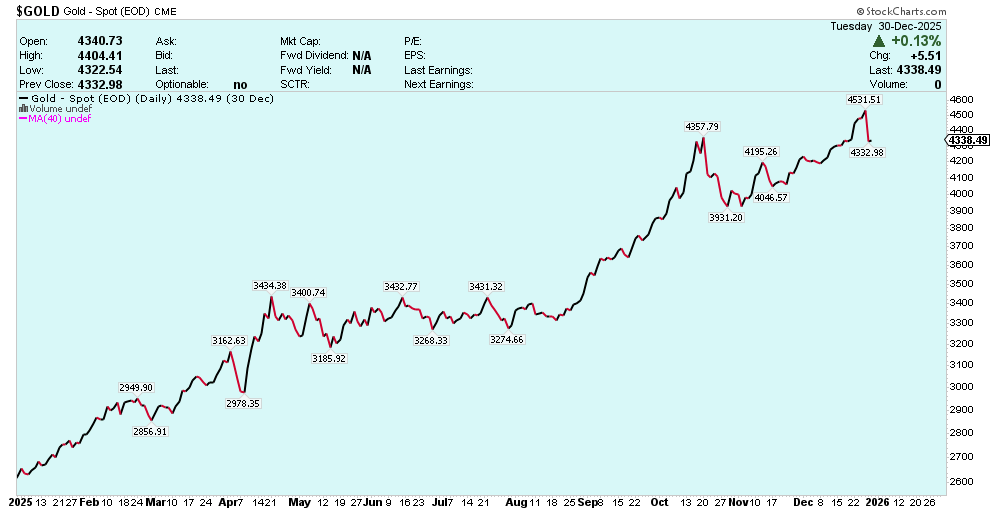 The most surprising thing in 2025 was the relative lack of volatility in the gold price bull run. It was smooth sailing through the large even numbers until a pullback in October before all time highs in December.