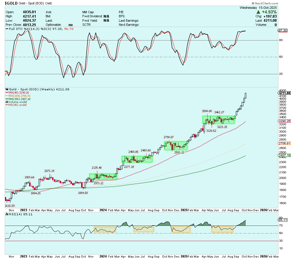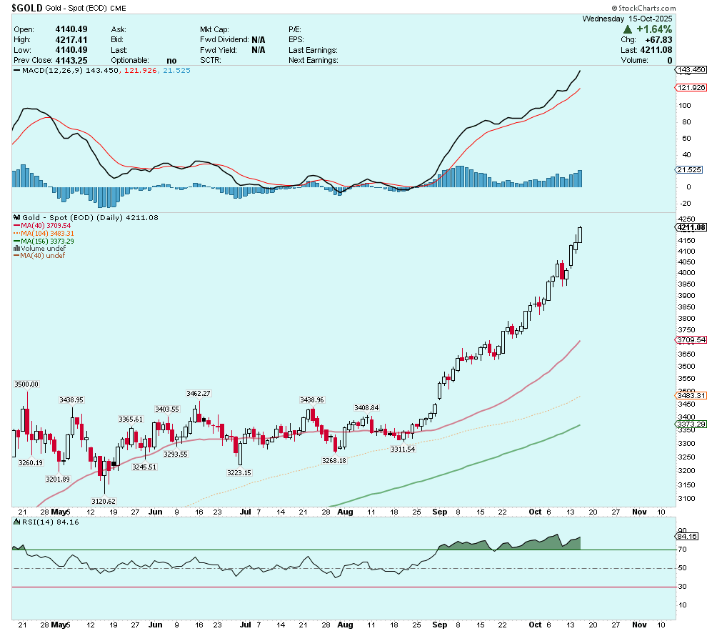 Technical analysts were beginning to call gold “overbought” in early September. Yet, it has only grown more and more overbought over the last six weeks.