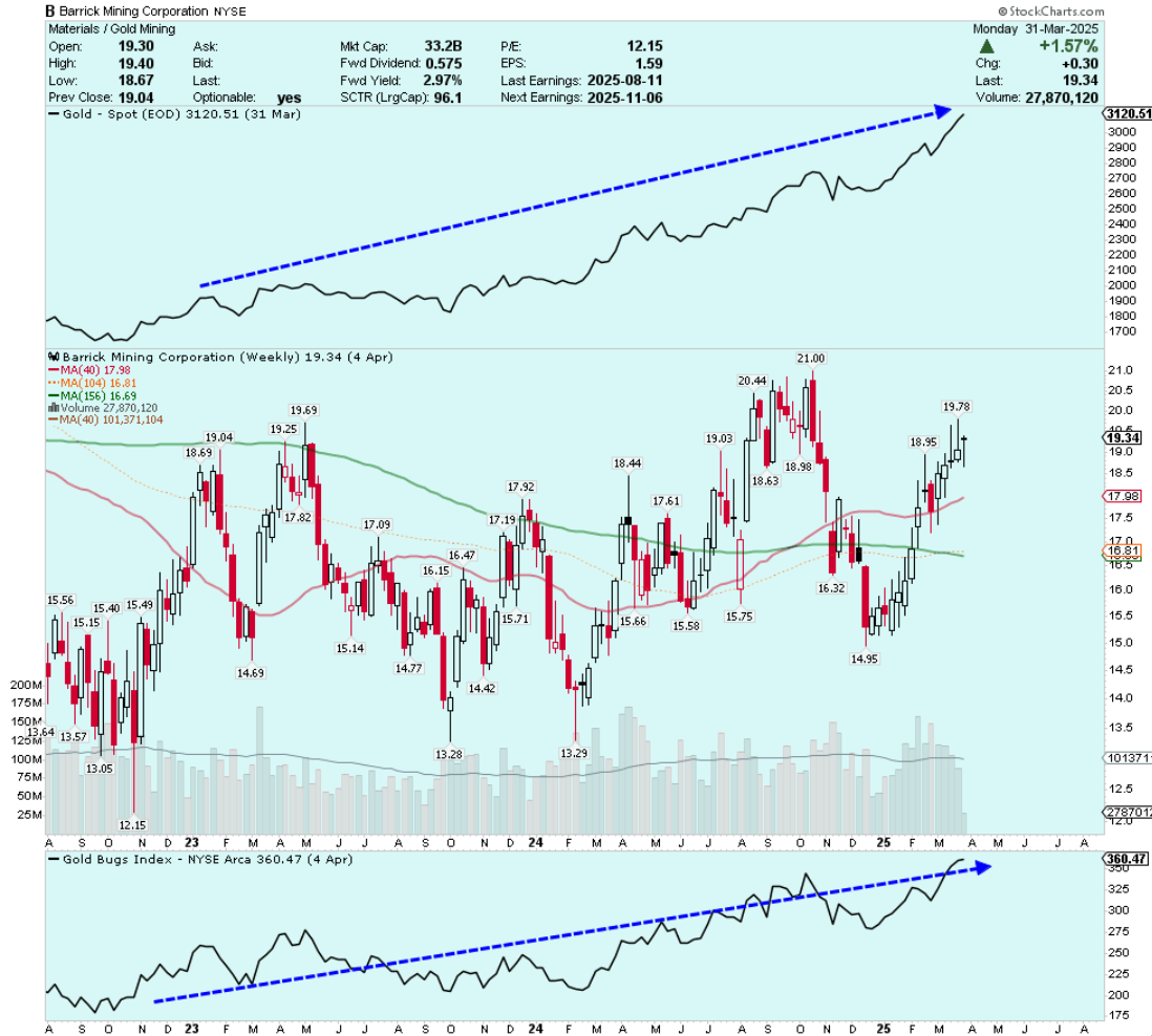 To keep this post clear and succinct, I will focus on just one stock. Barrick Mining (NYSE: GOLD, TSX: ABX) has long been a laggard in the gold mining sector. In fact, from early 2023 to early 2025 (12/31/2022 to 12/31/2024), during a period when gold rallied by roughly $1,000 per ounce, Barrick shares actually traded lower!