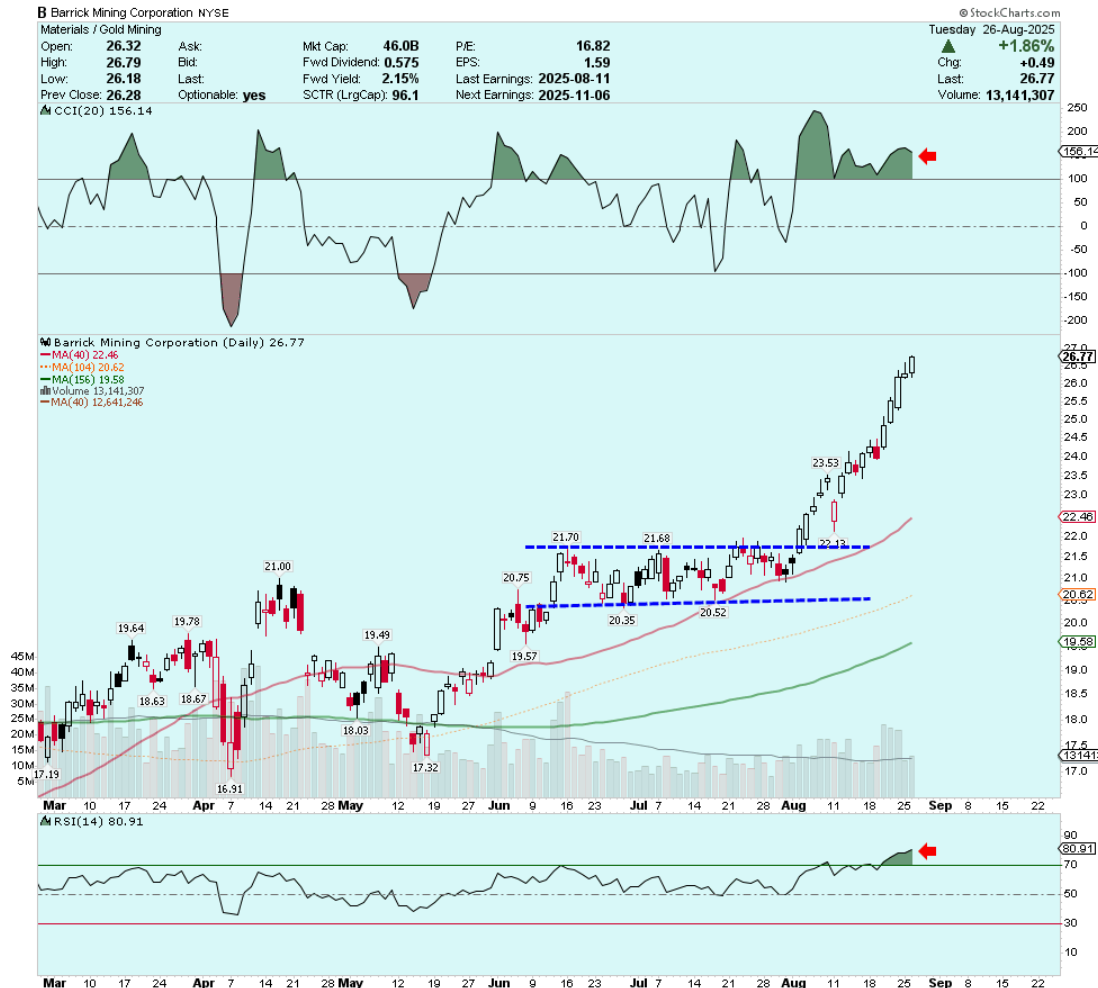 During the August rally, Barrick shares have had 3 down days, but there have not been consecutive red trading sessions (evidence of bullish buying pressure).