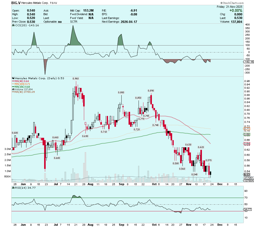 Shares of Idaho copper-silver explorer Hercules Metals have drifted since reaching a September peak at $0.89. BIG.V is at its lowest levels since the early-April tariff turmoil, as investors seem increasingly content to book losses for tax purposes and wait until the new year to reassess the company’s progress.