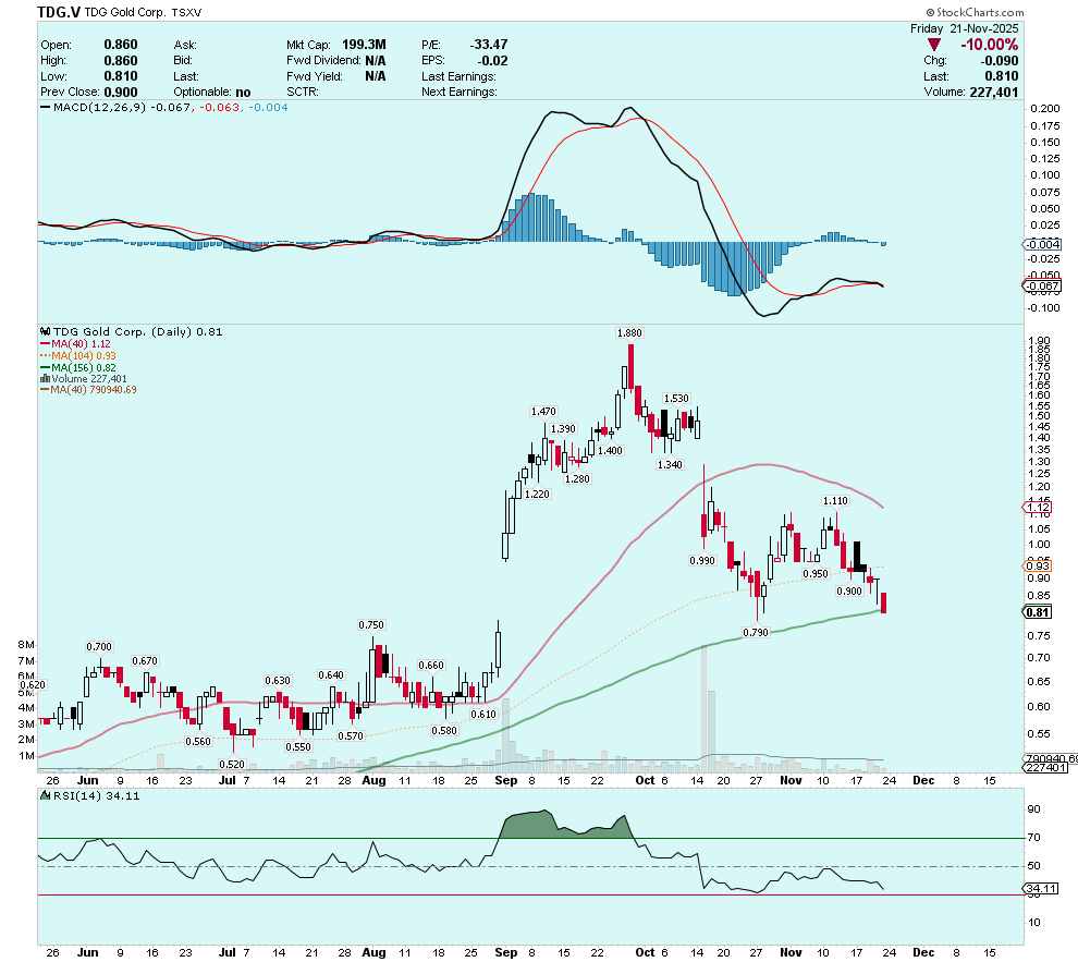 After a big run-up in September on the back of intersecting 100 meters grading 2.24 g/t gold in the first hole of the 2025 drill program, TDG shares have fallen back to Earth, nearly filling the September gap at $0.76.