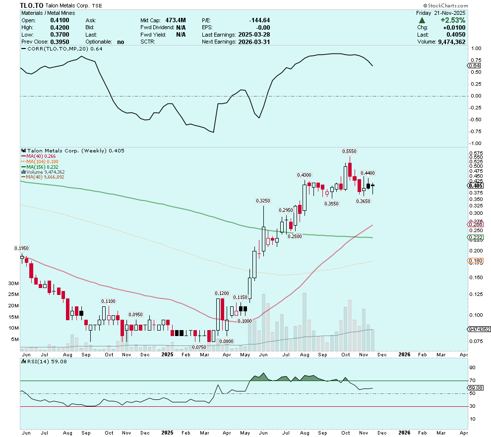 While some may be frustrated that Talon shares are flat over the last three months, there are emerging signs that Talon may be on the verge of embarking on its next leg higher. These positive signs include a fading correlation to rare-earths play MP Materials (NYSE: MP), and last week’s 2.5% gain in Talon despite declines across all major equity indices. Additionally, progress in terms of federal government support for critical-minerals development continues apace—the SPEED Act (a comprehensive permitting-reform package) has moved into the House of Representatives for a full vote in the coming weeks (H/T PILATVS on CEO.ca).