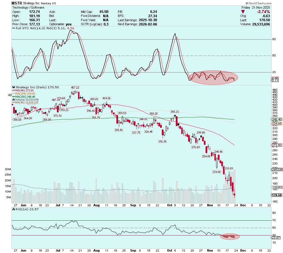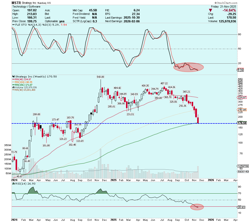 MSTR is now deeply oversold across all timeframes, and Friday’s close right at the rising 156-week moving average is significant. A bounce-back to the $200–$230 range should be expected in the near term. Should such a rebound fail to materialize, it would be a highly concerning sign that Michael Saylor’s Strategy is at increased risk of a painful unwinding.