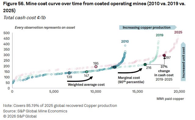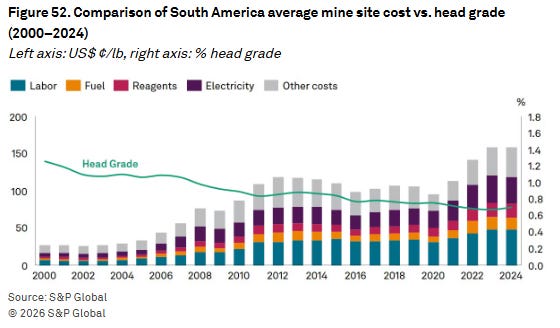 Average ore grades are in a long-term downtrend while mining costs continue to rise each year