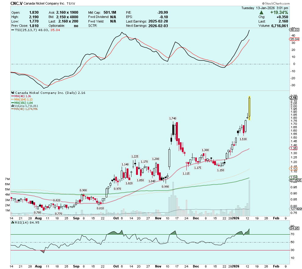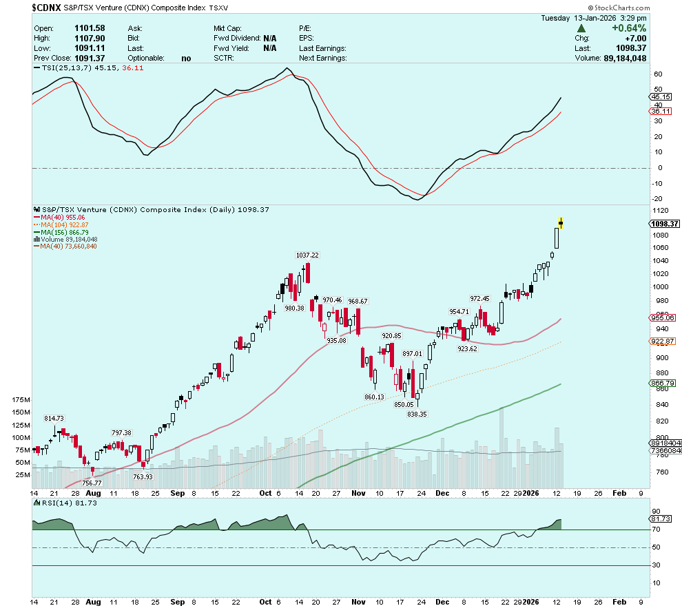 We’re eight trading days into 2026, already the TSX-Venture Composite is up more than 10% and the GDXJ is up more than 11%. Meanwhile, silver producers such as Hecla Mining (NYSE:HL) and Coeur Mining (NYSE:CDE) are up ~27% and ~19% respectively.
