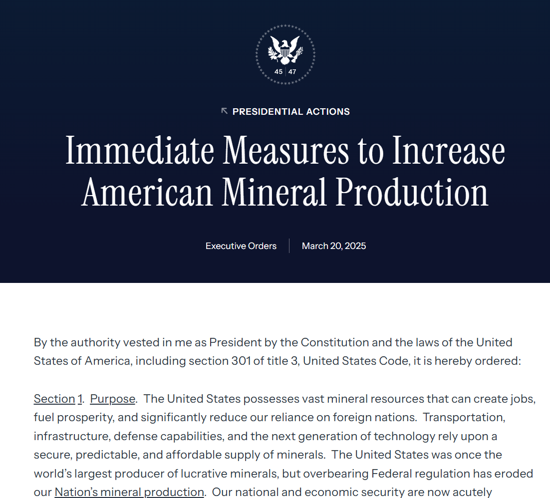 Earlier today, President Donald Trump signed an executive order invoking the Defense Production Act (DPA) to bolster domestic production of critical minerals, aiming to reduce U.S. reliance on foreign sources, particularly China. The reliance on foreign adversaries for these critical minerals has now been officially deemed a national security threat. Thereby, harnessing the vast resources of the US government to ensure that a robust and secure US critical minerals supply chain is developed.