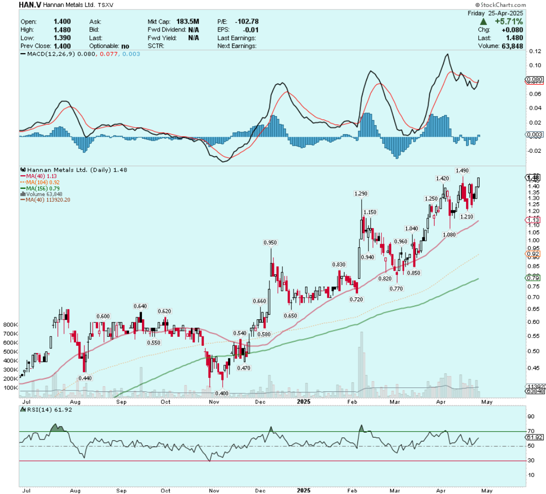 Meanwhile, Peruvian copper-gold explorer Hannan Metals (TSX-V:HAN, OTC:HANNF) continues to see its share price reach new heights: