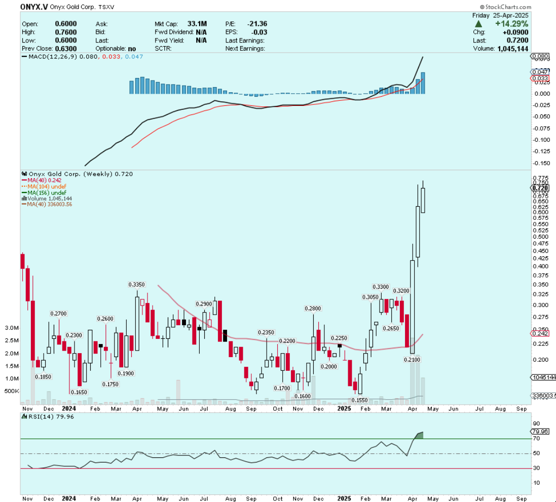 Onyx Gold (TSX-V:ONYX, OTC:ONXGF) has quickly evolved into one of those “Bull Market Adjustment Trades” - the company delivered a special drill intercept (69.6 meters grading 3.4 g/t gold) earlier this month and more and more investors are beginning to tune into the potential at the Argo North Target in Timmins. A tight share structure and a sharp, young CEO offers a lot to like about ONYX.