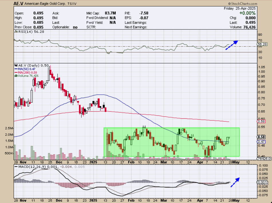 Since delivering a disappointing set of drill results in January, AE shares have been traversing a range-bound oscillation. There is some minor resistance at $.55, followed by a gap fill up at $.65: