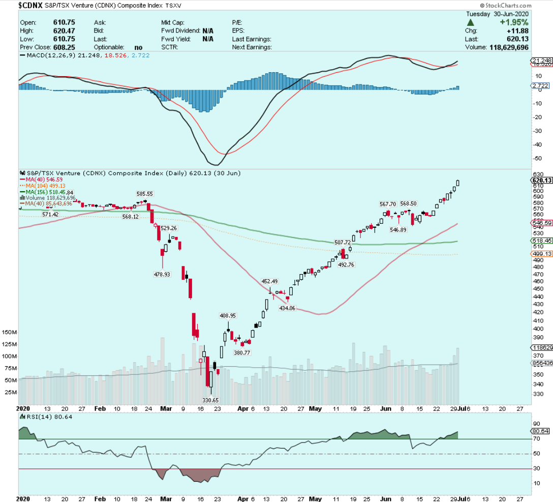 The TSX-V has recovered impressively in the last few weeks; rising nearly 20% from its 546 low reached on April 7th. The 653.82 weekly close is the highest close for the Canadian small/micro cap index in nearly three years.