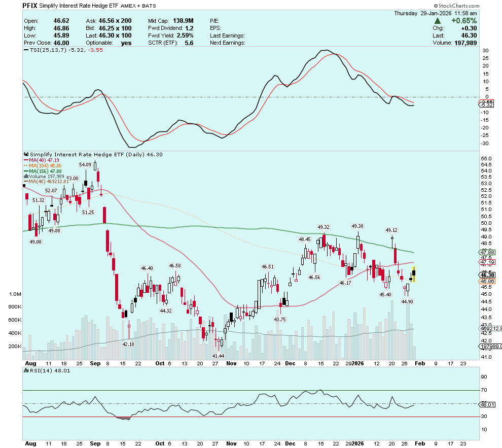 PFIX is an exchange-traded fund designed to hedge against a sharp rise in long-term U.S. interest rates. It’s not a traditional bond fund — it’s a tail-risk hedge that uses derivatives to potentially benefit if rates spike higher, especially at the long end of the yield curve (like the 20–30 year Treasury yield).