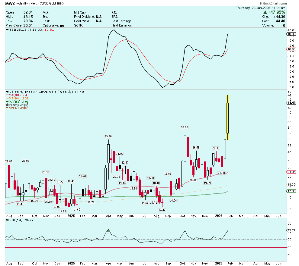 The CBOE Gold Volatility Index (GVZ) is close to its March 2020 covid crash highs.