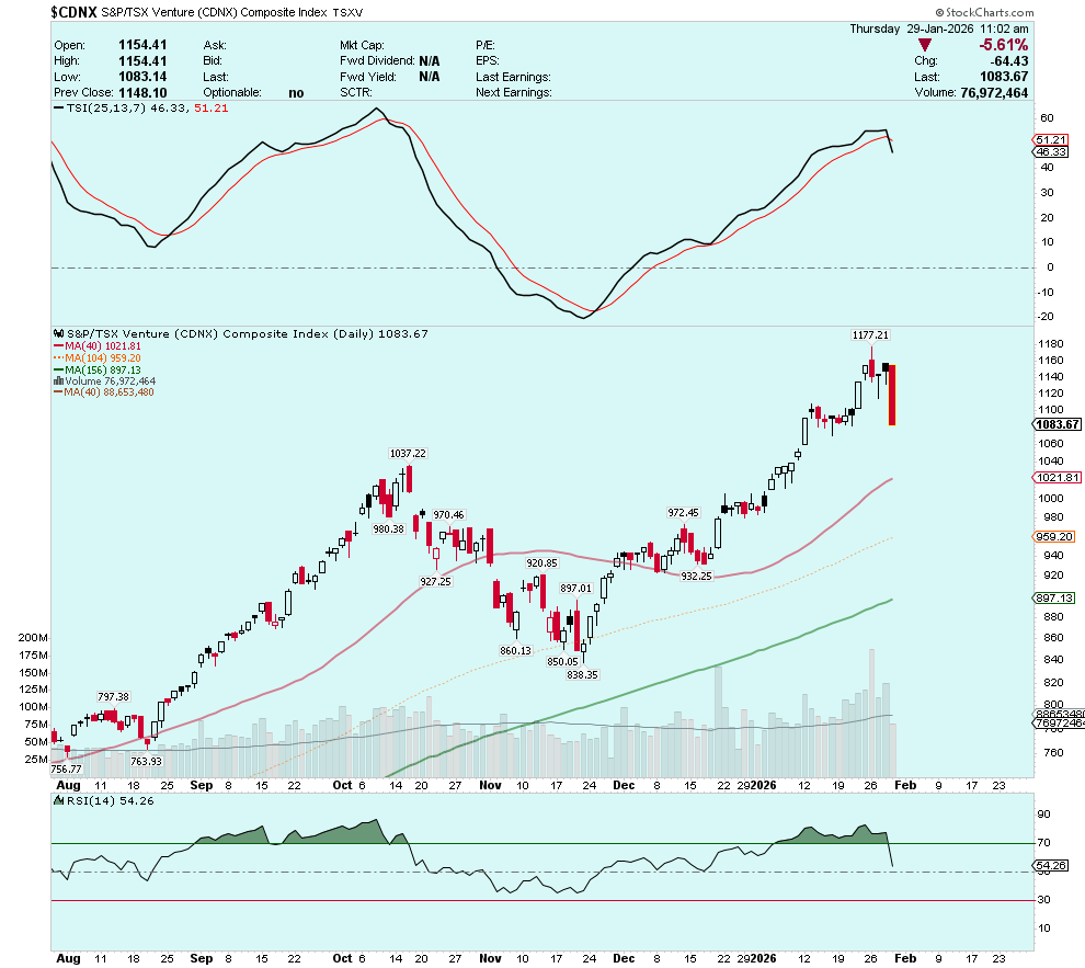 The small/micro-cap TSX-Venture Composite peaked on Monday and has since begun to roll-over: