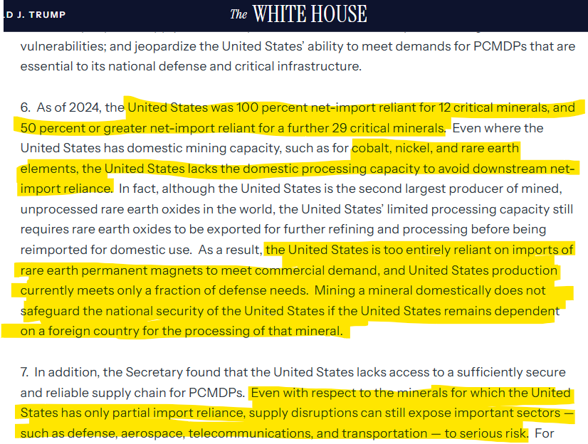 The proclamation clearly pinpoints rare earths as being a major strategic vulnerability. Cobalt and nickel are also mentioned as two metals which the U.S. has mining capacity, but remains vulnerable in terms of processing capabilities making it net-import dependent.