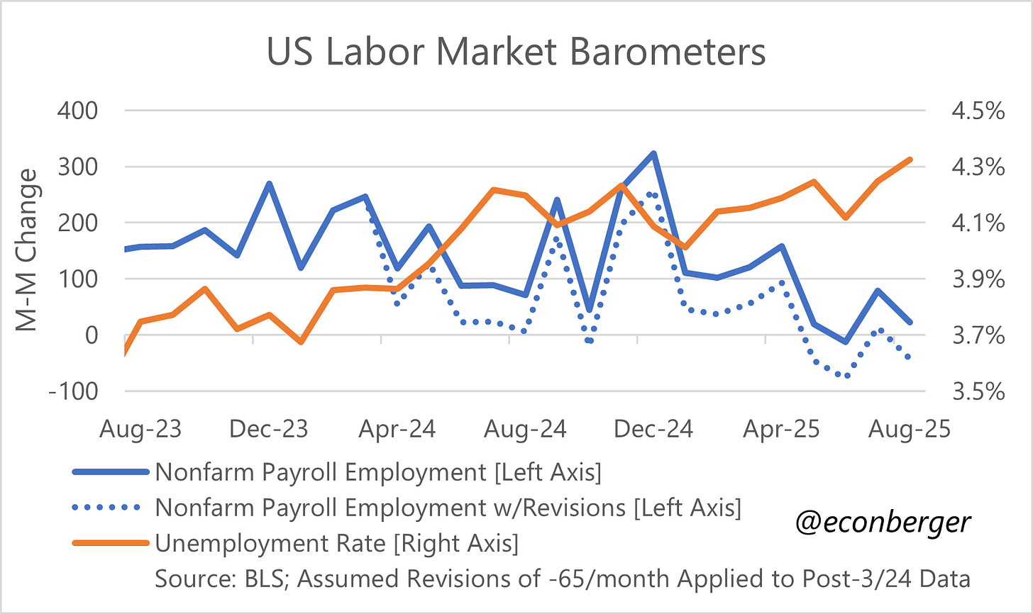 This morning’s August NFP report was indeed conspicuously weak, with August payrolls barely changed at a paltry +22,000, and June now being revised to a loss of 13,000 jobs.